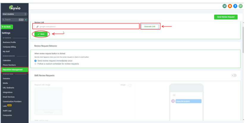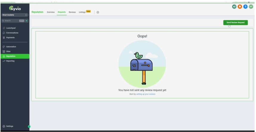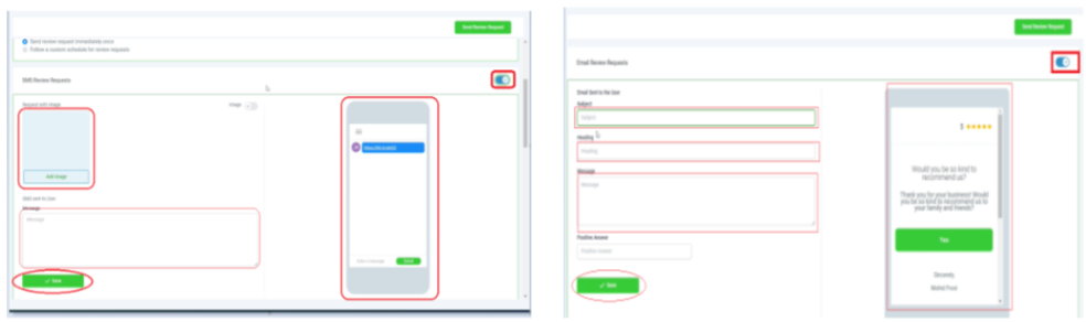 To request reviews from your customers, you can click on the "SMS Review Request" toggle. This will allow you to add a picture and customize the text of the SMS message you want to send. For email requests, you can open the email option and give it a subject line, headline, and a perfectly crafted message. After composing your message, you can post it as a response to your customers.