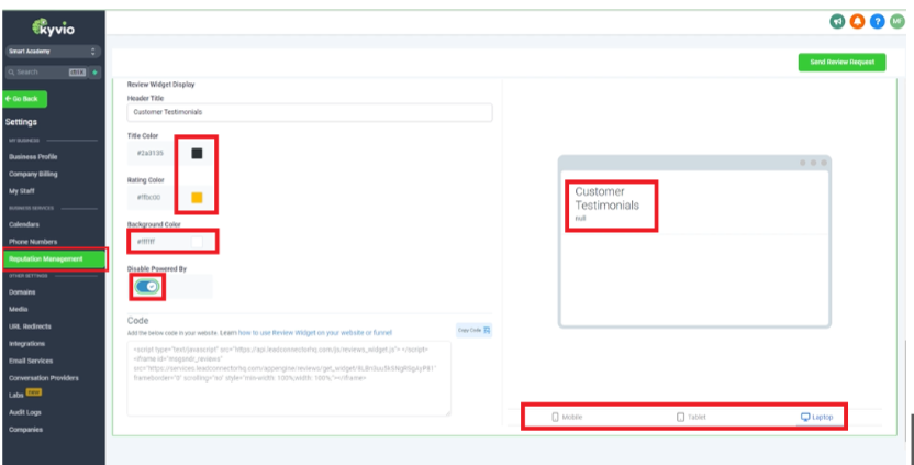 You have the flexibility to customize the appearance of your review requests across different devices such as mobile, tablet, and laptop. You can create and personalize both email and SMS review requests. Additionally, you have the option to modify the colors of the text, rating stars, and the overall background according to your preference. The rating stars can be displayed with different ratings like five stars or four stars. You can also include a title to grab attention. If you wish to showcase your business prominently on Google, you can enable the Google My Business integration. Alternatively, you have the choice to disable it. This way, you can provide a tailored and powerful review request experience to your customers.